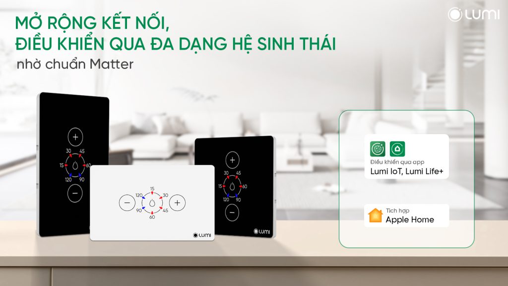 Được tích hợp giao thức Matter – “ngôn ngữ giao tiếp” chung hiện đại nhất giữa các nền tảng nhà thông minh, công tắc nóng lạnh Lumi xóa bỏ mọi rào cản giữa các nền tảng, dễ dàng tích hợp cùng nhiều hệ sinh thái thiết bị thông minh như Apple Home, không giới hạn trải nghiệm người dùng. Nhờ đó, bạn cũng có thêm nhiều lựa chọn điều khiển thiết bị thông minh như điều khiển bằng giọng nói nhờ tích hợp cùng loa thông minh.