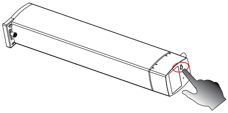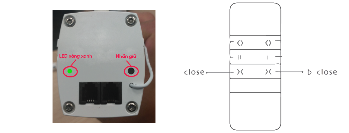 Người dùng nhấn giữ nút nhỏ trên động cơ rèm LED sáng xanh đến lần thứ 2 thì thả tay. --→ Ta nhấn nút Đóng (Close) trên remote rèm.