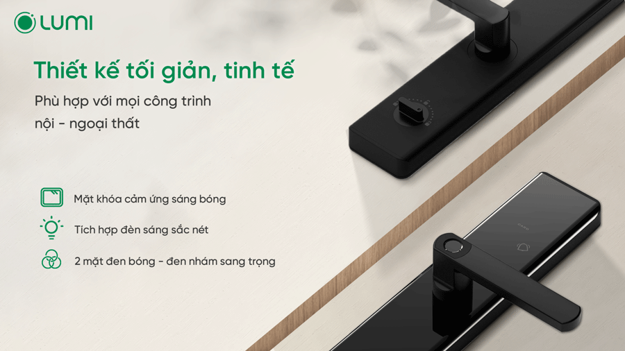 Khóa thông minh Lumi có thiết kế hiện đại, đơn giản, tinh tế, thân thuộc với các gia đình Việt. Mặt khóa cảm ứng sáng bóng, giao diện dễ quan sát, tích hợp đèn sáng sắc nét giúp dễ dàng sử dụng kể cả vào ban đêm. Sản phẩm được thiết kế với “tông” màu đen đơn giản, tinh tế nhưng vẫn đảm bảo nổi bật, sang trọng, phù hợp với nhiều không gian nội thất, công trình kiến trúc. Ngoài ra, khóa thông minh Lumi có tay nắm ngang trợ lực, giúp cho thao tác mở khóa dễ dàng cả với người già hay trẻ nhỏ.