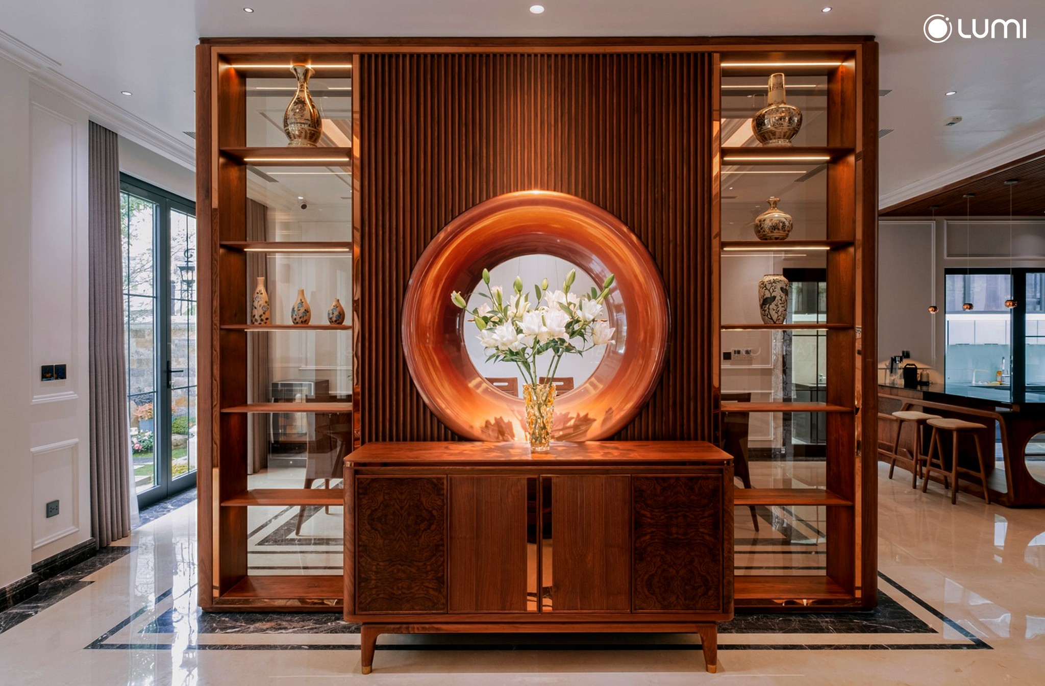 Với thiết kế chiếu sáng Lumi Lighting, các chuyên gia thiết kế chiếu sáng đã tỉ mỉ tính toán sao cho các lộ đèn spotlight không chỉ phục vụ chiếu sáng sinh hoạt mà còn giúp “nâng đỡ”, tôn lên các món đồ trang trí, chi tiết nội thất tâm đắc của gia chủ. Kết hợp cùng đèn thả Lumi sang trọng, tinh tế, tổng thể trải nghiệm chiếu sáng tại căn biệt thự càng trở nên ấn tượng.