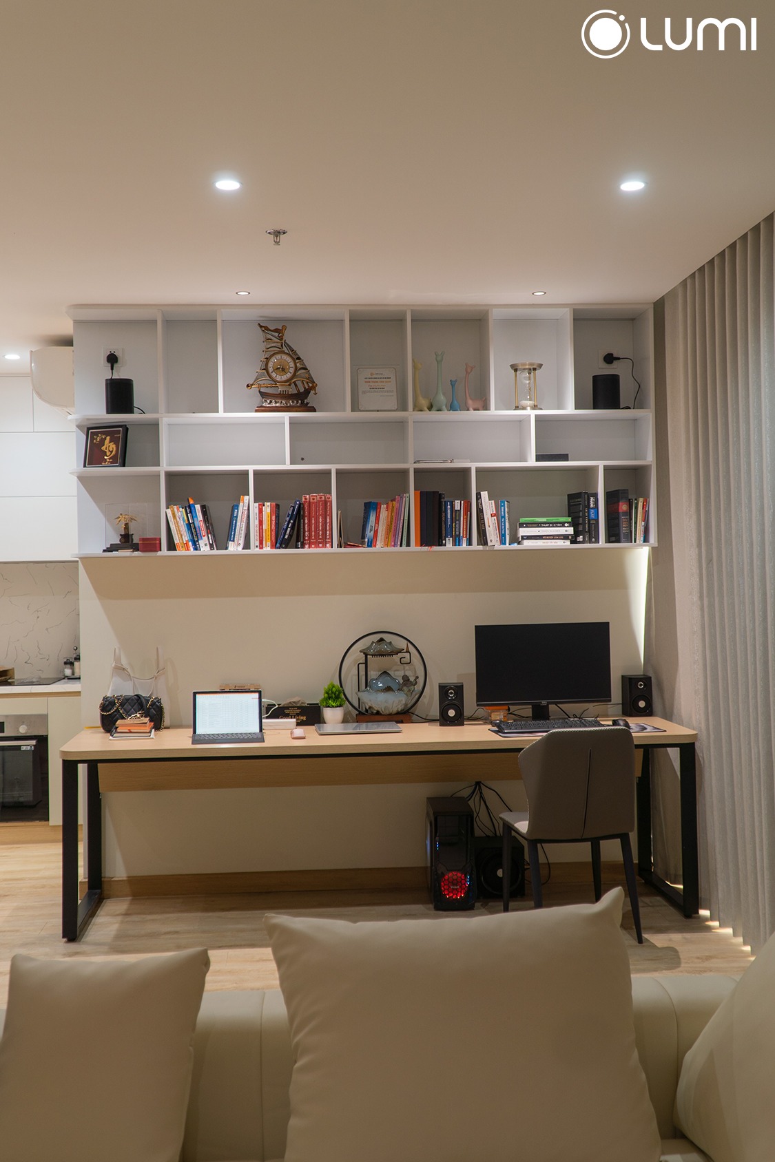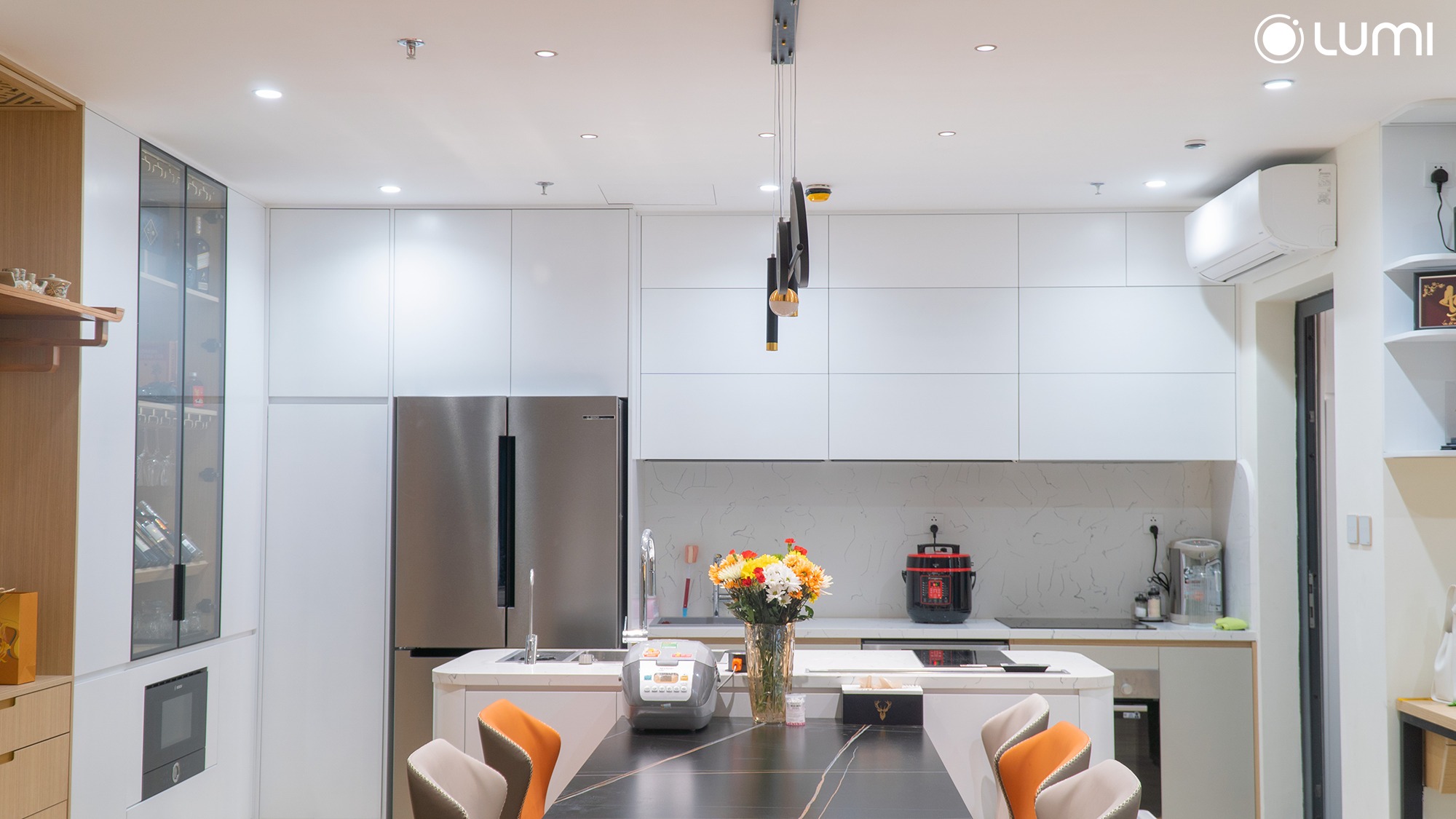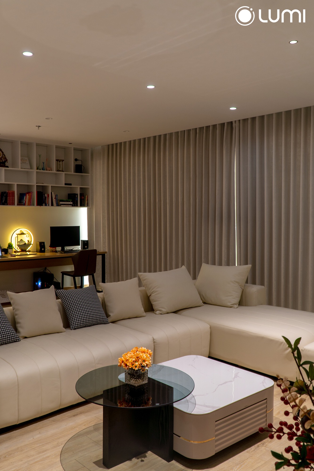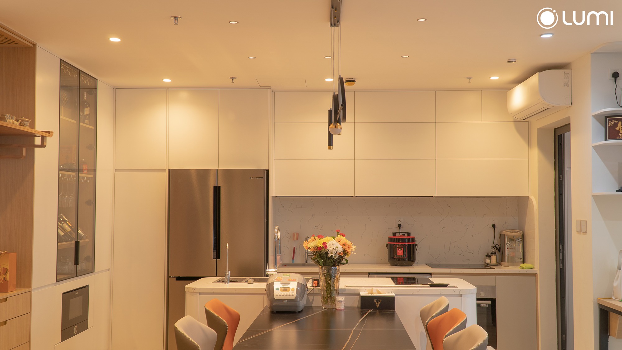 Vô cùng tâm đắc với các giải pháp chiếu sáng, gia chủ đã lựa chọn chiếu sáng thông minh từ Lumi cho cả căn hộ. Sự phối hợp linh hoạt giữa 2 loại đèn Spotlight và Downlight từ Lumi đã giúp căn hộ “khoác” lên mình một diện mạo mới, hài hòa giữa ánh sáng và nội thất, hơn nữa giúp không gian trở nên rộng thoáng hơn.
